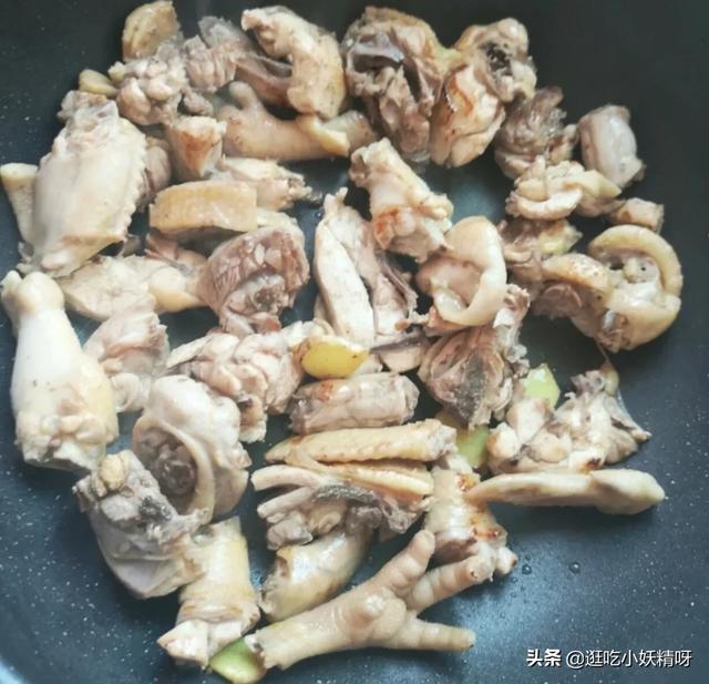 2.土鸡去肥油,剁小块,起锅少许底油,下入土鸡块和姜片翻炒至生水炒干,土鸡香味飘出。
