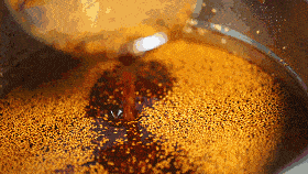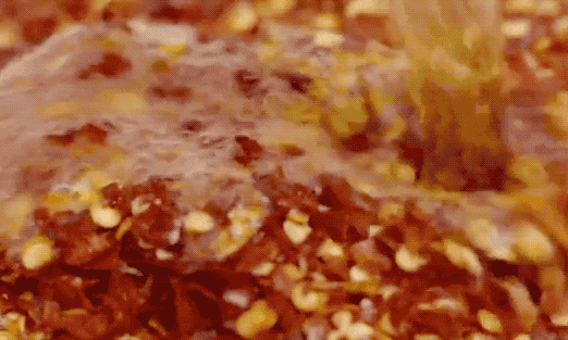 - 继续加热油温到7成大冒烟。关火等待15秒,此时温度175度。往辣椒面里倒三分之一的油搅拌,油过之处有些焦黑,不要紧这是正常的。再等待20秒,此时温度155度。再倒入三分之一搅拌。再等待30秒,此时温度115度,将剩余的油倒入搅匀即可。我为什么要强调温度,因为这是标准化的威力,让一个完全没有经验的人也能做出很完美的辣椒油。所以,如果拿不准温度,可以去某宝上买一个探针温度计。