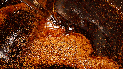 - 将一半的辣椒籽倒入锅内继续小火翻炒,只炒到辣椒籽发黄有坚果的香味,倒出放凉。其他的辣椒籽可以丢弃。