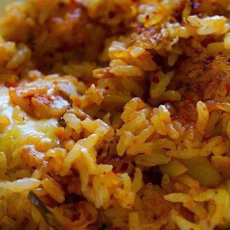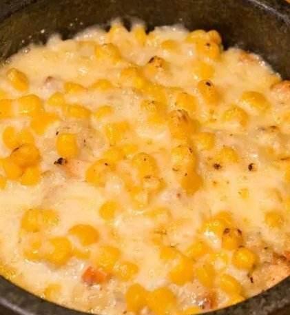 2、锅内加入黄油20克融化。加入蒜碎爆香、放入圆葱、焯水过后的玉米粒90克翻炒均匀;加入培根丁继续煸炒,用盐8克,白胡椒5克,芝士粉15克调味。继续翻炒均匀,放入泰国香米饭继续炒匀,倒入淡奶15克提香。放在烤盘,铺平后在表面均匀的撒上,马苏里芝士碎80克。放入烤箱,用220度烤10分钟。看到芝士起焦时、取出装盘即可。