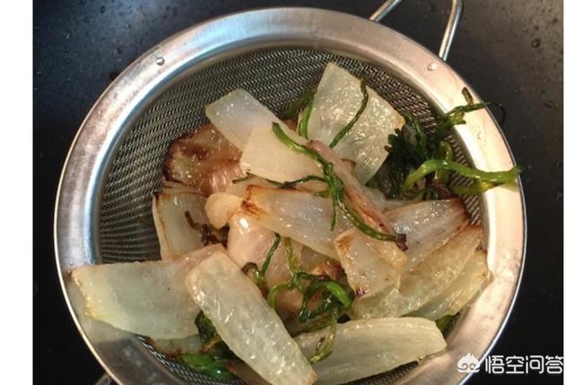 5、洋葱切片,锅中加入适量的底油,放入洋葱片和香菜小火翻炒,炒香待洋葱变得焦黄,香菜变蔫盛出不要。