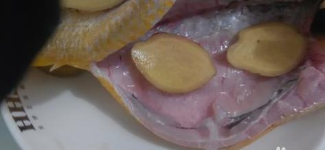 三、鱼放盘子里,鱼上面,下面和腹腔内都要铺上姜片。