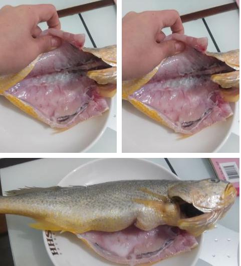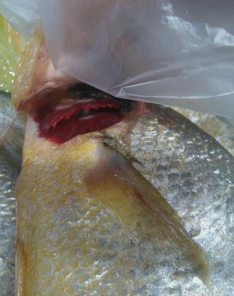 一.超市买鱼,黄花鱼没有活的,是海鱼,都是死的,挑新鲜的,看我下面的腮,是红色的,有的是灰色的,那就不新鲜了,千万别买。超市有免费收拾鱼的地方,让他们收拾好再拿回家,要去鳞去鳃。