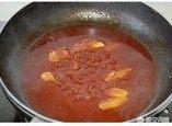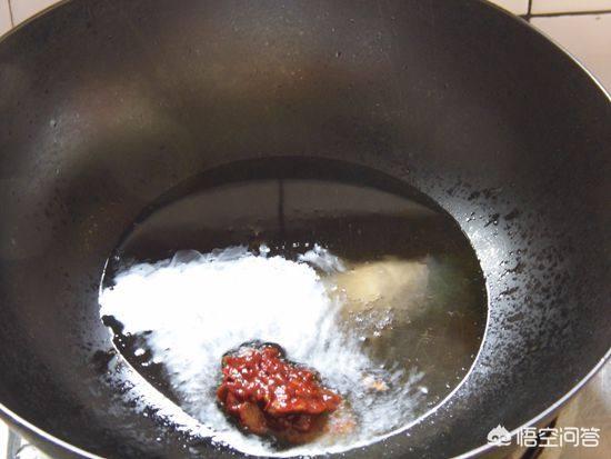 8.锅里倒入植物油,油6成热时放入郫县豆瓣酱一勺炒出红油,如上图