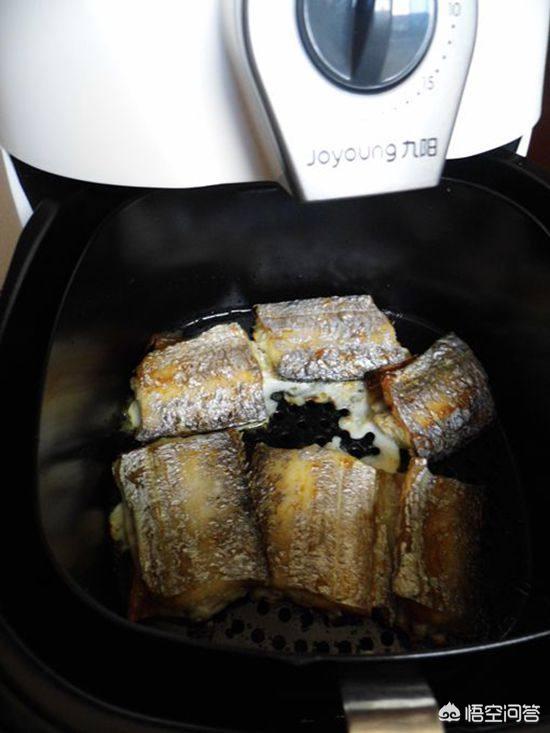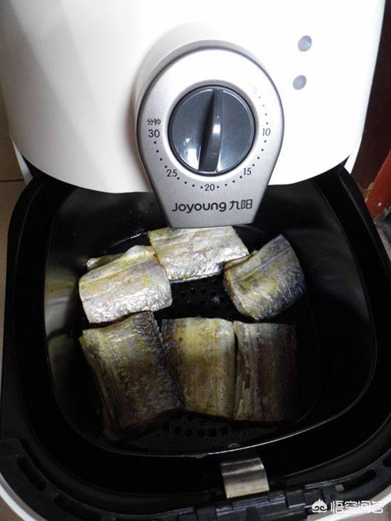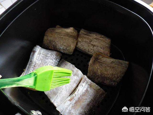4.空气炸锅温度调至200度,预热5分钟,炸蓝里刷上一层油再放入腌制后的带鱼,在带鱼的表面刷一层油,如上图