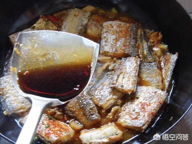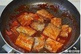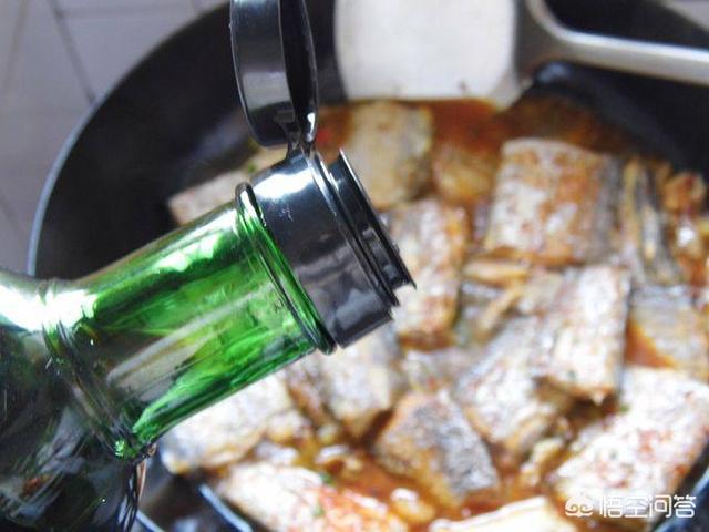 11.再倒入炸好的带鱼,调入两汤匙料酒,1勺生抽,如上图