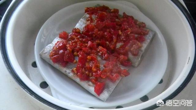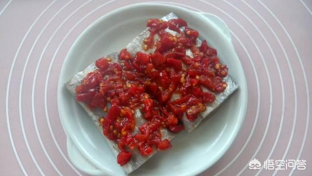 3.腌好的带鱼去掉姜丝沥干,料酒后铺上剁椒继续腌制10分钟