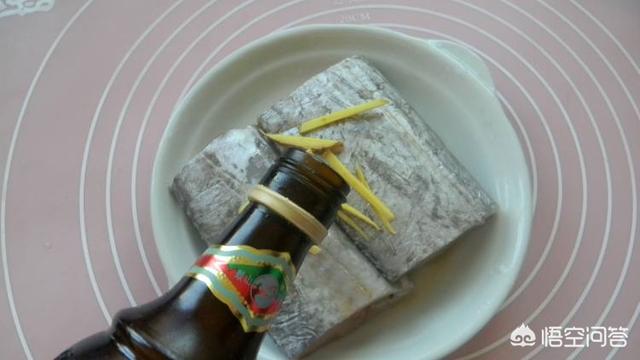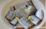 2.把带鱼放入盘里,撒上姜丝、淋适量料酒腌制15分钟,如上图