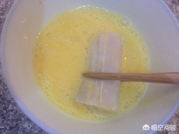 4.取一个鸡蛋打散,把将蛋液均匀裹满带鱼,可以放少了生粉