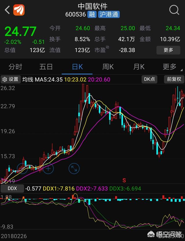大家可以看看中国软件的K线图,对于这种短线牛股,一般都是双顶的,现在就是第二波上涨结束后的回调期。你们可以看看DDX的情况,这个是大单占流通盘的比例,DDX向下,说明主力在出逃。因此,中国软件大概率是向下走势的。短期来看,应该回避。当然,如果贸易战又出了新消息,国产替代又被热炒,中国软件就会短线调整,站稳10天均线后上攻。