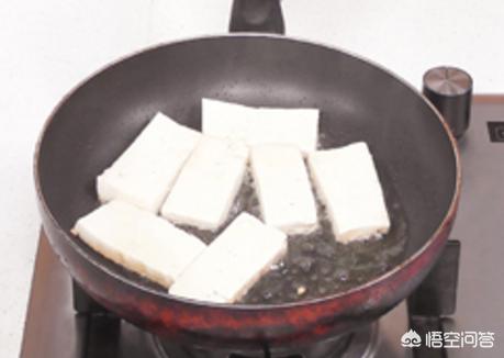 放入切好的豆腐,晃动煎锅,煎出香味。