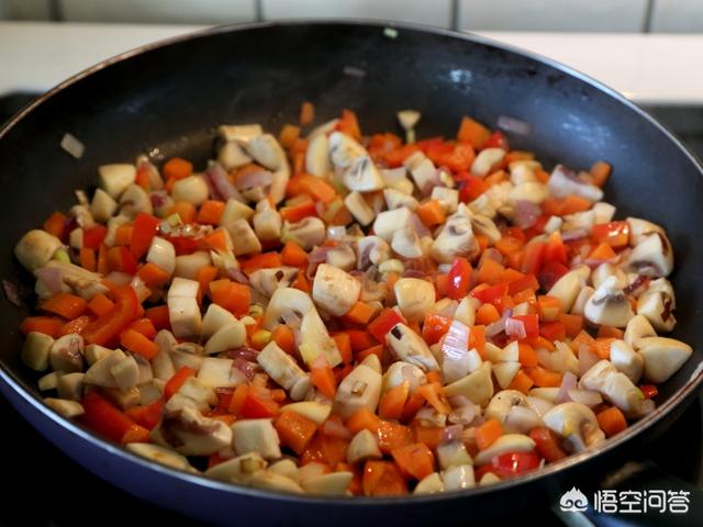 11.炒出香味后下胡萝卜、蘑菇和红椒丁炒。注:毛豆这时不下锅,因毛豆是速冻的不易烹调太久。