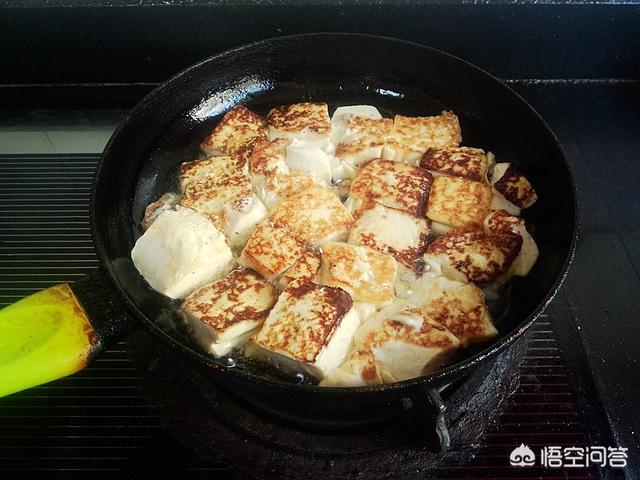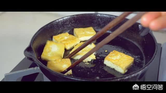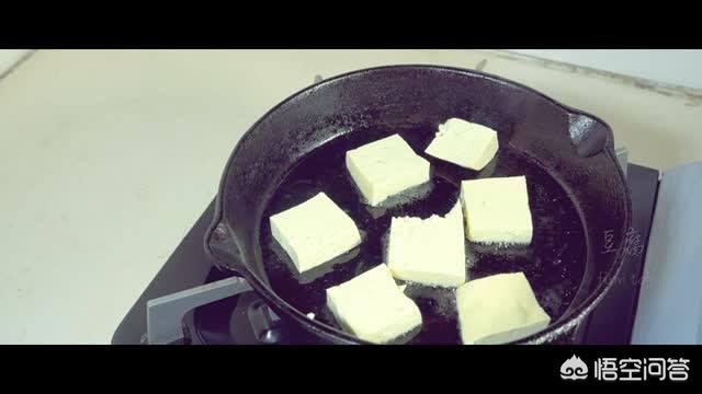 2.锅中入玉米油,放入豆腐煎。
