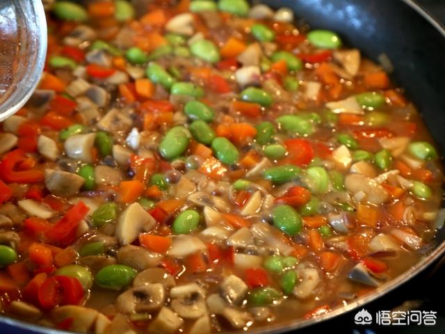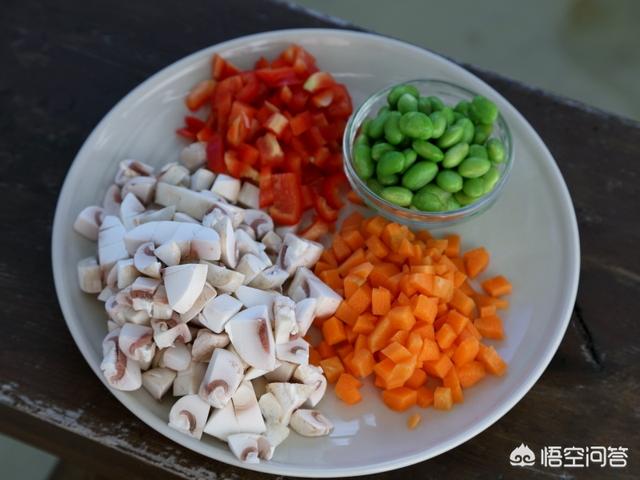 【辅料】植物油30克、盐少许、毛豆米50克、胡萝卜50克、蘑菇100克、红椒40克、洋葱50克、大葱30克、生姜、老抽、生抽、白砂糖、醋、虾籽油各适量,高汤适量、淀粉适量、胡椒粉少许