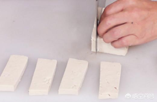 洗好的豆腐修齐边缘,再切成长方块,备用。