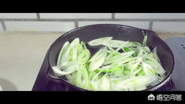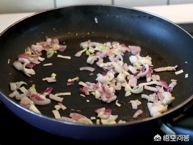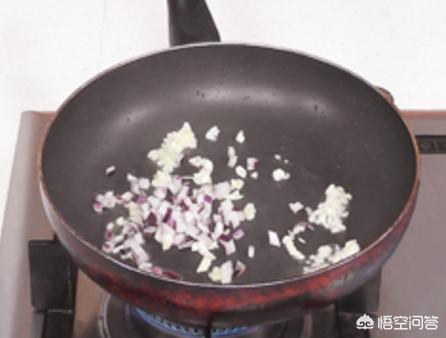 10.锅里再倒油,油烧热后下洋葱、大葱和大蒜炒。