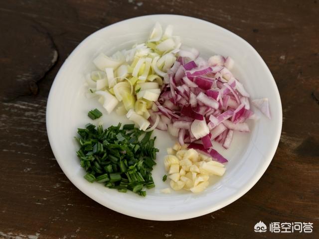 4.洋葱切丁、大葱切花、大蒜拍碎、蒜苗叶切碎。