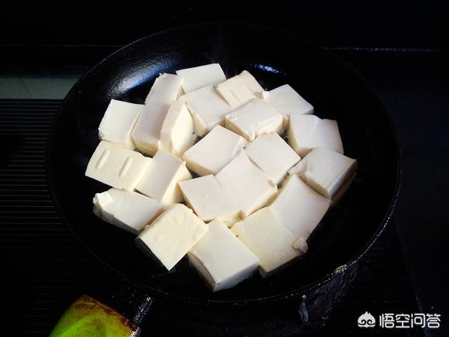 2.豆腐切小块,放入锅中,