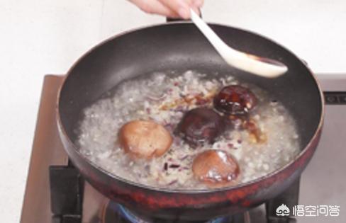 用油起锅,撒上姜末、蒜末,爆香,倒入洋葱末。炒出香味,注入适量清水,放入切好的香菇。