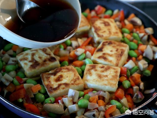 12.炒到蔬菜变色后,将毛豆和前面煎好的豆腐下锅,再浇上我们调配的碗汁,根据情况可能还要再多加一碗高汤。
