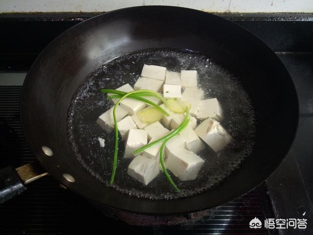 7.锅里水开,放入豆腐块,加姜片,葱节煮开,