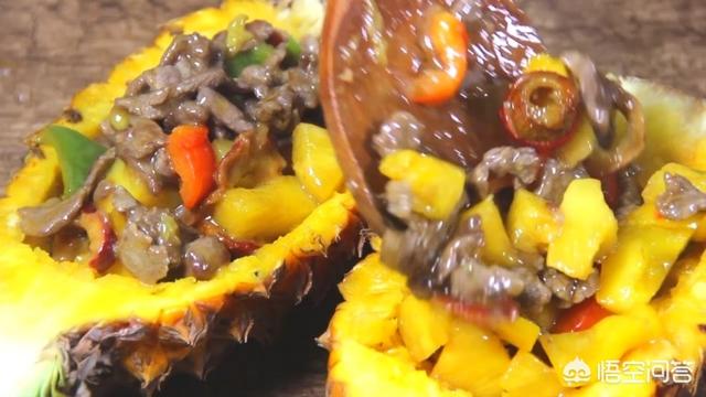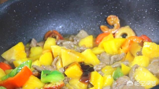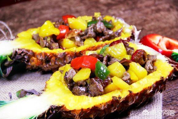 【主料】牛肉300克、青/红/黄椒各20克、菠萝300克、