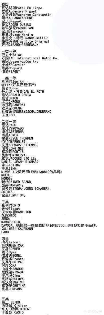 而''新版分类评级''则是一位对表有着深刻了解的行家,在参考价格、机芯与技术等等因素后作出的评选。同样在21世纪初评选出。(下图为新版分类评级)