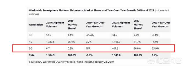 IDC在2019年初的时候,做过一个预测:2019年5G的市场份额不足0.5%;到2023年,市场份额占比为26%。我并不同意这种预测,我认为在2023年,至少我国的5G市场占比最少在70%以上;可能IDC看的是全世界,按照中国的这个步伐,达到100%不可能,但是超过七八十是很有可能的。