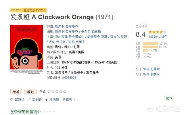 《发条橙》这部电影占据豆瓣电影TOP250 中NO.216,豆瓣电影TOP榜是根据每部影片看过的人数以及该影片所得的评价等综合数据,通过算法分析产生。豆瓣每天都有用户进行“很差”到“力荐”的评价。