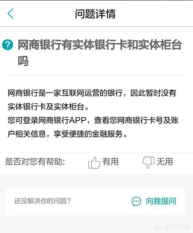 浙江网商银行为何线下没有取款机? 新农商网 更新于 2023-08-05 16:17:03 全部 1024 浙江网商银行为何线下没有取款机? 回复 共1条回复 我来回复 JacksonBauery 这个人很懒,什么都没有留下~ 评论 浙江网商银行是一家互联网银行。它暂时没有实体的银行卡,也没有实体的网点。只能通过手机APP进行操作。既然没有实体银行卡,也没有网点,那么就是说网商银行暂时是只在线上运营的,那么自然也不会有取款机了。附上网商银行APP内的介绍。 赞同 2018-03-03 18:20:00 0条评论 请 登录 或者 注册 后回复。