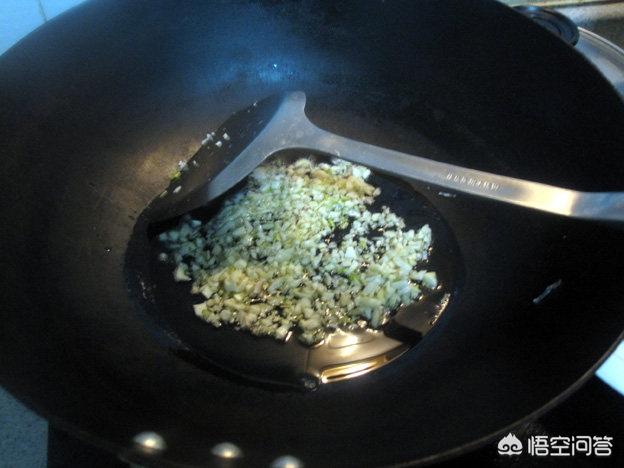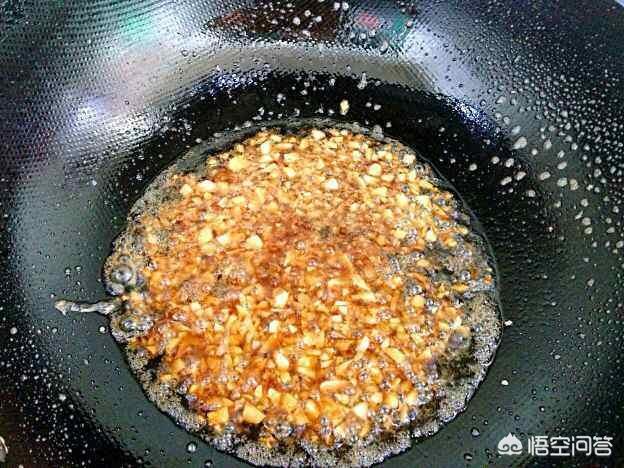 3.起油锅烧至6成热,改小火放蒜末、盐、生抽、耗油炒香,如上图