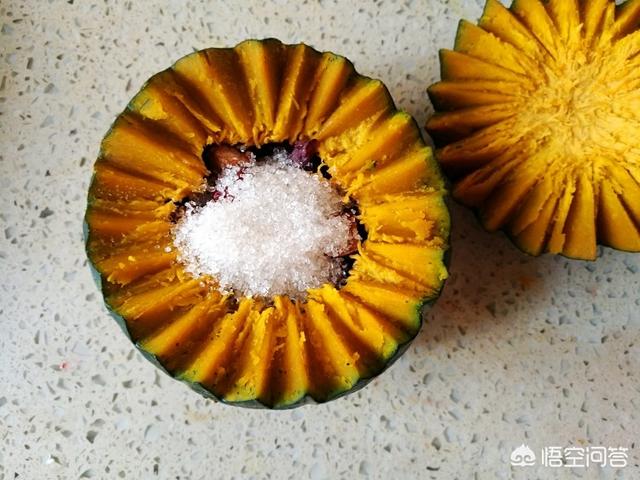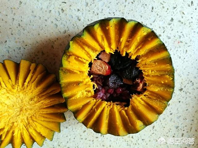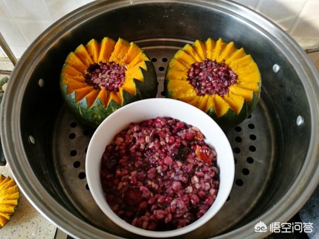【主料】小南瓜一个。【辅料】食用油10克、白糖8克、薏米5克、高梁米适量、人参籽量、红枣适量、龙眼干适量、燕麦适量、黑米适量。【做法】