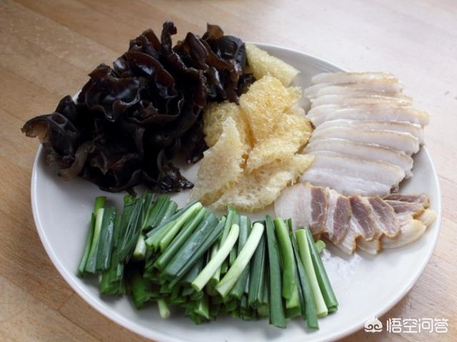 5.将煮好的五花肉和咸肉切片,泡发的炸肉皮切成菱形,泡发的木耳撕成小朵,韭菜切段。