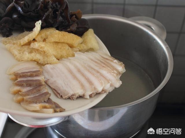 6.舀上几大勺子煮肉的高汤加盐调味,将咸肉片、熟五花肉片、泡发炸肉皮、泡发木耳先入锅煮开。