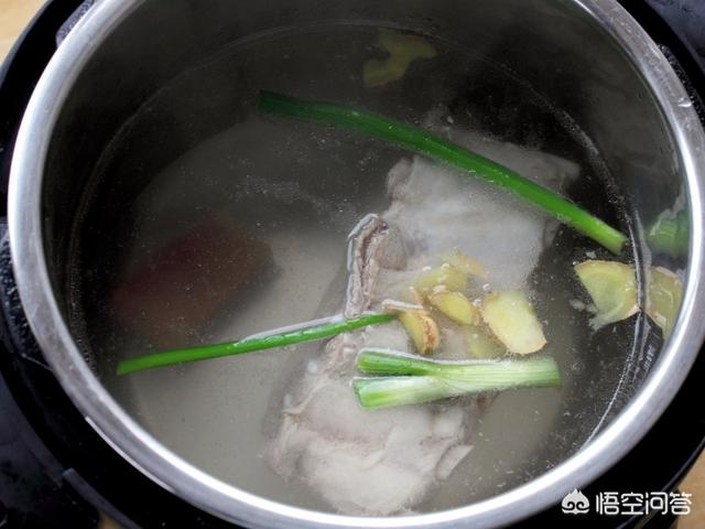 3.另起一锅清水放入咸肉和焯好的带排骨的五花肉煮开,再次撇去污沫,然后放入小葱和生姜,高压炖煮10分钟即可。