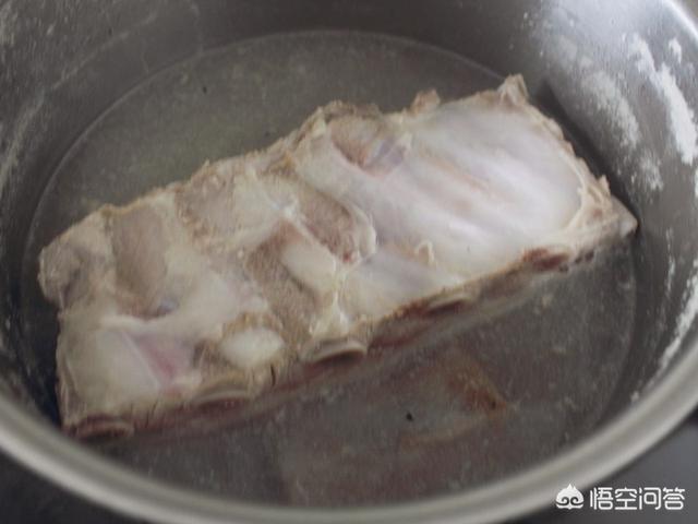 2.带排骨的五花肉在开水中焯烫出血污,用温水清洗干净。