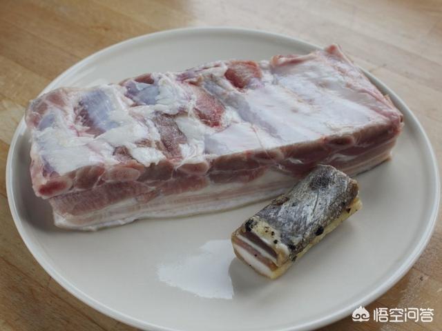 1.首先煮高汤。备好带排骨的五花肉500克和咸肉50克。