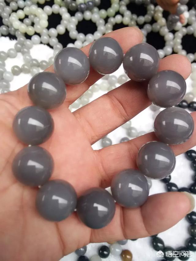 而青海青花的墨色是以点状聚合式分布,整体粗略看,黑色成为一块块的,但如果肉眼仔细观察或用放大镜观察可发现,其墨色是一个个点状墨色密集而成,且里面经常会夹杂一些亮闪闪的细沙点。其黑白分布边境模糊,墨是融在玉中,有的会呈现出紫色光晕,料质相较而言稍显疏松且略干,其也称为青花山料。下图为青海青花手串