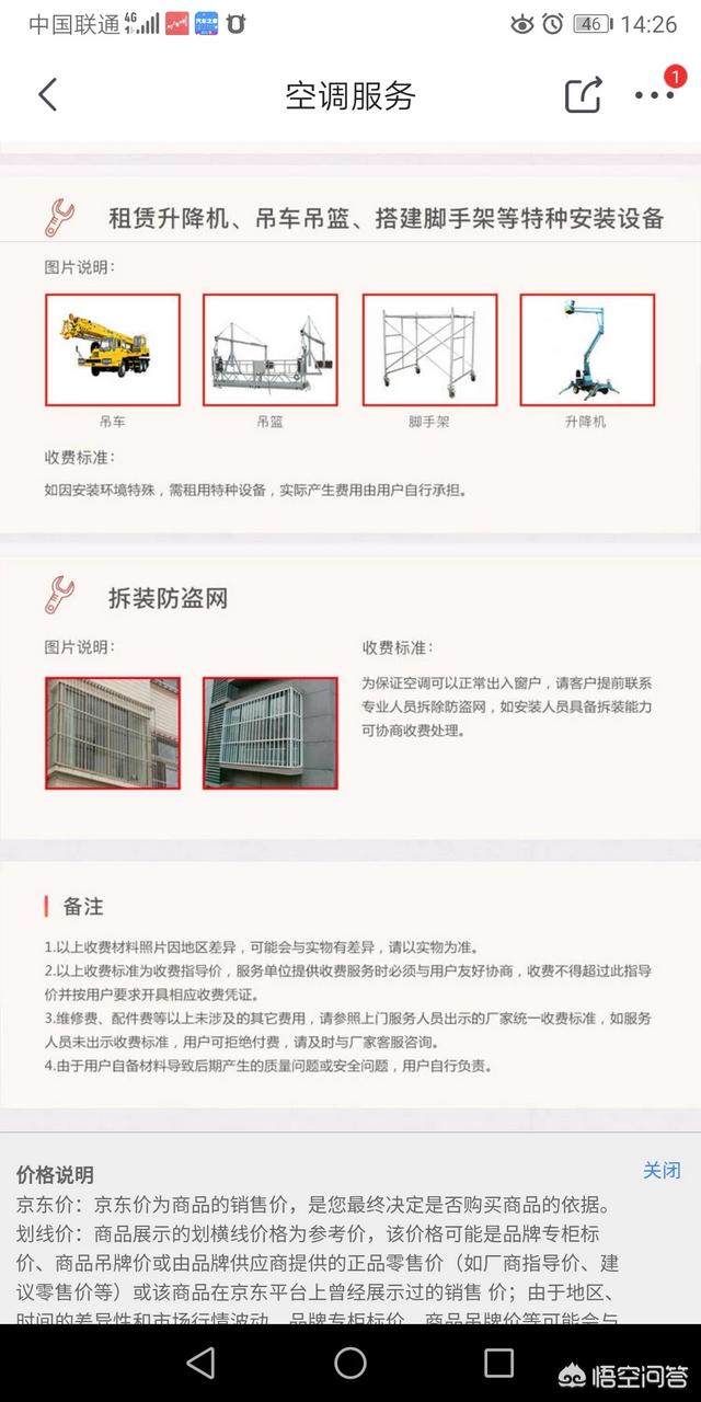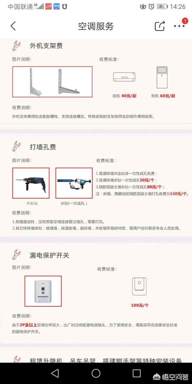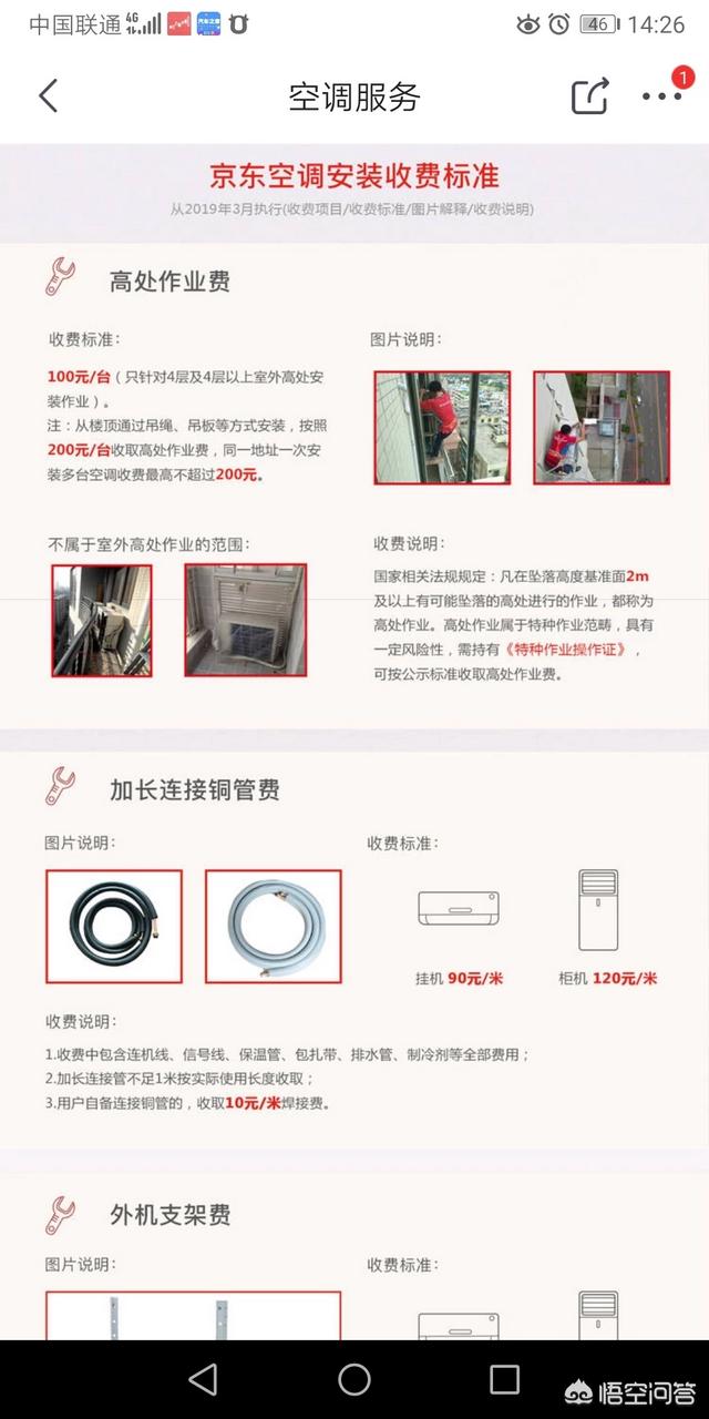 截图来源于京东资料,我认为是比较合理、可以接受的,我自己亲身买过一台空调,并预约售后安装,因为原来房间墙壁已有孔位,实际只是花了40元的空调支架费用即可安装完成,速度也很快。我表示认可。谢谢。