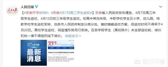 昨晚,安徽省人民政府发布 2020年春季学期全省学生返校安排通告: