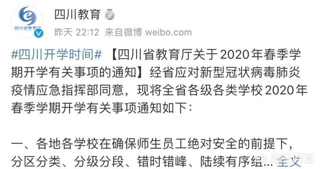 昨晚,四川省教育厅官方微博发布了“四川省教育厅关于2020年春季学期开学有关事项的通知”: