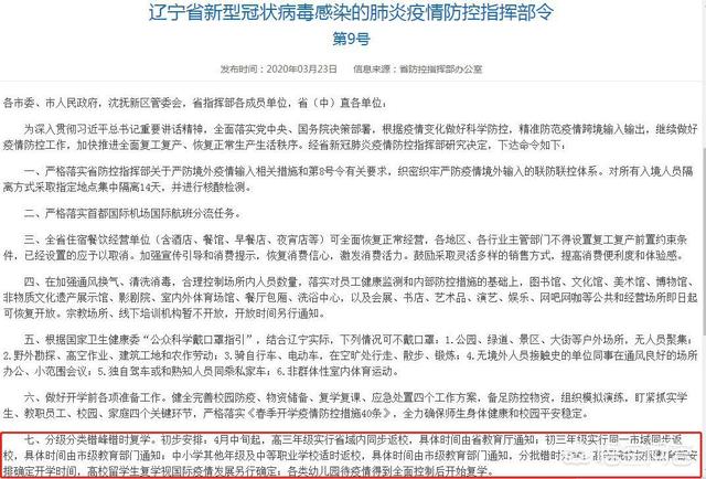 3月23日上午,辽宁省发布辽宁省新型冠状病毒感染的肺炎疫情防控指挥部令第9号,该省将实行分级分类错峰错时复学。