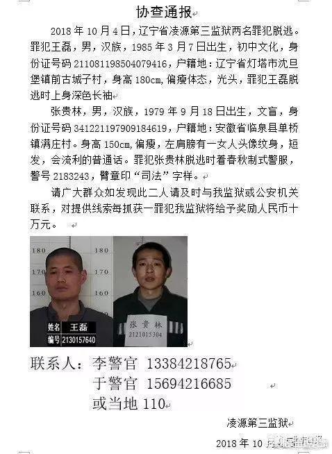 10月4日,辽宁凌源第三监狱两名罪犯越狱。其中王磊,系犯有绑架罪。张贵林犯有抢劫罪,一个死缓改无期,一个无期徒刑,两人都是罪大恶极的重犯。