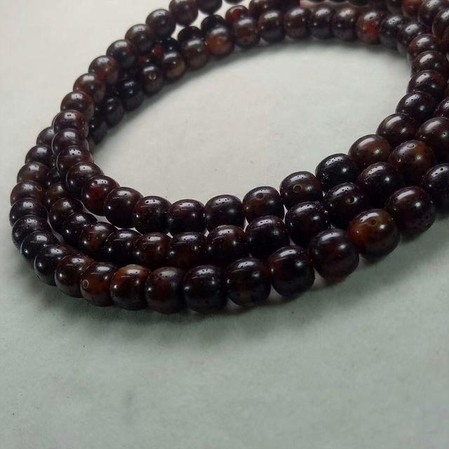 第四种说法:还有一种说法是玉化的星月菩提,是菩提果成熟以后,经过5-8年左右的存放发置养籽,将原籽内部的油性、颜色、硬度最大发酵转化。本身就久经放置的海南熟透籽,经岁月风化,自然沉淀,沥去水分,使得颜色、密度已经最大化的稳固,根本就无需担心盘玩的色差问题,而且它的本身的油性大,随意的盘捻就能很快包浆圆润,达到玉化的效果。