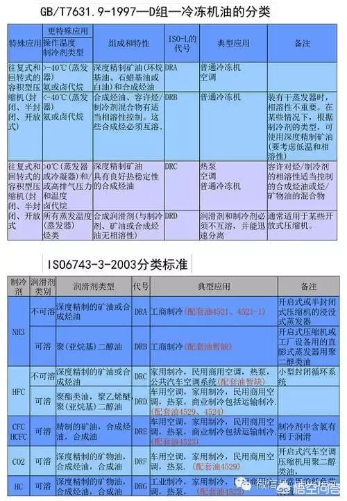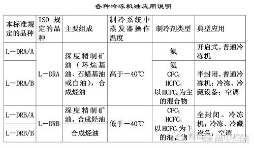 国际标准化组织在ISO 6743/3B-1993分类标准中,根据冷冻机油的组成特性、蒸发器的操作温度和所用制冷剂的类型,把冷冻机油分为DRA、DRB、DRC和DRD共4种。随着行业用油的新需求,国际标准化组织在2003年对ISO 6743/3B- 1993进行了修订(新标准为 ISO6743/3B-2003),在新标准中,根据制冷剂与冷冻机油的相溶性,将冷冻机油分为DRA~DRG七个品种。