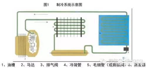 制冷系统主要包括压缩机、冷凝器、毛细管、蒸发器四个组成部分。制冷系统工作原理见图1。