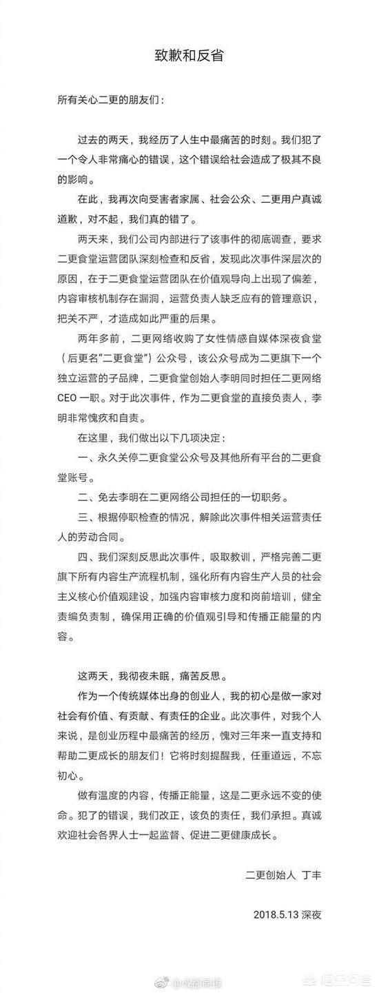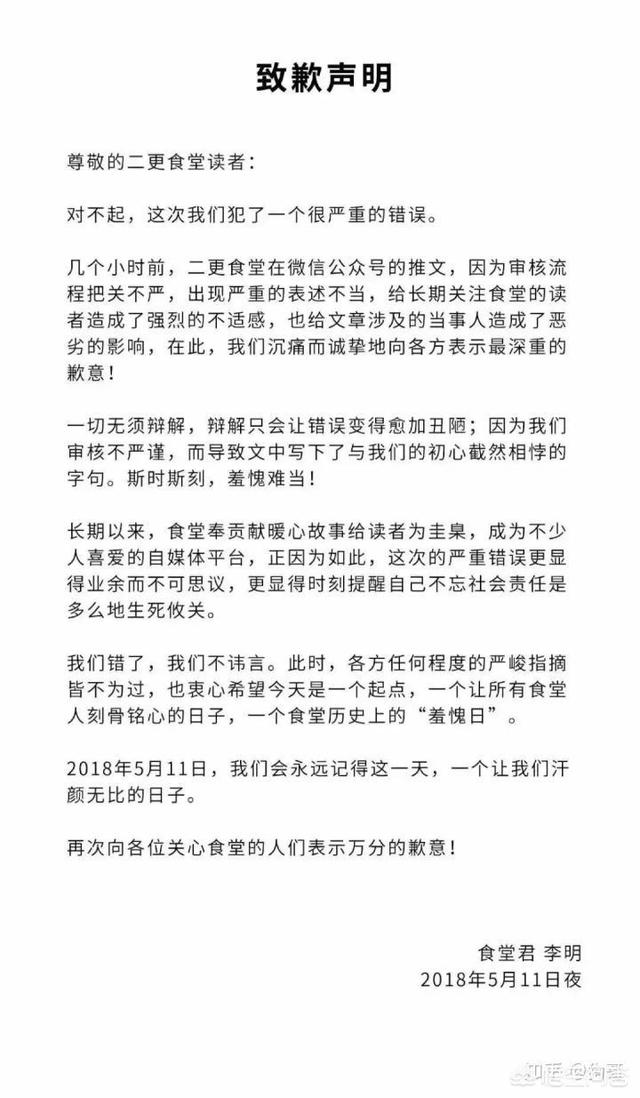 5月11号当天,二更食堂对不当推文发布了道歉声明,5月12号浙江省网信办会同杭州市网信办就二更食堂,发布低俗文章一事约谈该公众号主要负责人。