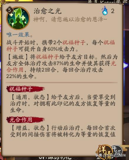 草爹的奶是一个主动性技能,与其自身的攻击力有关联,也是阴阳师游戏中唯一一个根据自身攻击力来计算奶量的式神。奶量在加强之后还是十分可观的。