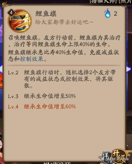 准确来说惠比寿负责奶人的是召唤出来的鲤鱼旗,惠比寿本身并不具备奶的功能。召唤出来的鲤鱼旗会继承惠比寿60%的生命,治疗量为鲤鱼旗生命的40%,当式神行动时回复其一定的生命。同时鲤鱼旗具有驱散作用,可以很好的驱散一定的控制。