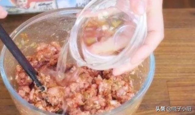 这一步是调制肉馅中最重要的一步。剁好的肉馅,比如说是一斤的量,加的水大概在2-3两,加水的过程要分好几次,每一次都少加一点,并且在加水的时候要用筷子按照一个方向不停地搅拌肉馅,等到感觉肉馅很有黏性了,再接着加水。这个加水的步骤必须是在第一步,如果加入其他的材料之后再加水,那整个肉馅最后会变味。加水的作用是什么呢?主要是使肉馅变得更鲜嫩、更爽滑。